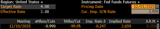 The voting members are split on whether to cut the Fed Funds rate by 25 basis points or keep it at the 3.75% to 4.00% range. However, as of this December 1 morning, the Fed Funds Futures market reflects a consumer expectation of ~ 99% likelihood that the Fed will cut the Fed Funds rate by 25 basis points. This is the highest chance that we have seen throughout November. On Monday, November 3, there was a 66% chance that rates would be cut 25 basis points. This probability dipped to 29% on Wednesday, November 19.